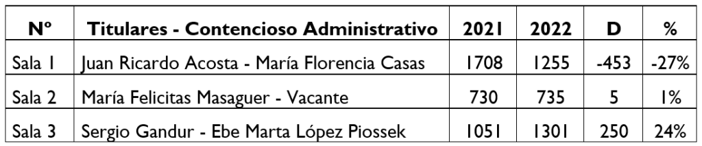 Sin la implementación de los juzgados de primera instancia, la cámara en lo Contencioso Administrativa sigue haciendo de trinchera y sus números lo demuestran, pues sigue siendo la que más sentencias aporta al conjunto, con 3291 lo que constituye el 36.5% del total. La disparidad entre las Salas 1 y 3 con la 2, que está integrada a medias, se mantuvo en forma clara a lo largo de 2022.