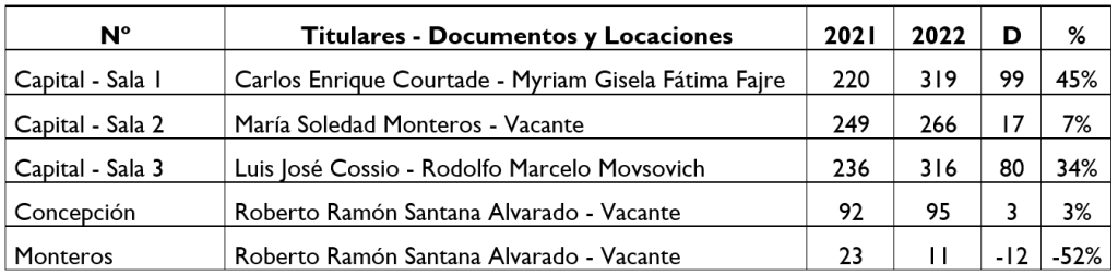 El podio de juzgados más productivos son los que se encuentran a cargo de Carlos Raúl Rivas (IIIª Nominación), Enzo Darío Pautassi (IVª Nominación) y el vacante de la VIª Nominación. El líder produjo un impresionante 82% más en comparación con su 2021.