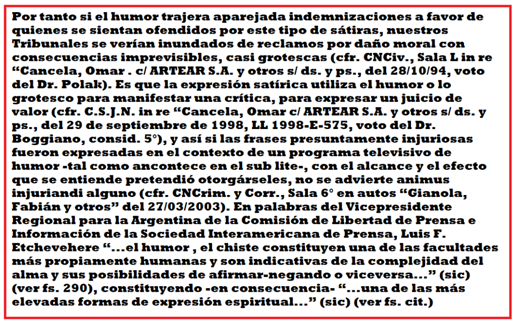 El juez rechazó la demanda. Si se aceptase la responsabilidad civil por la sátira, los tribunales no darían abasto (entre otras cosas interesantes), dijo la cámara al confirmar la sentencia que fue en favor del humor como expresión de la crítica.