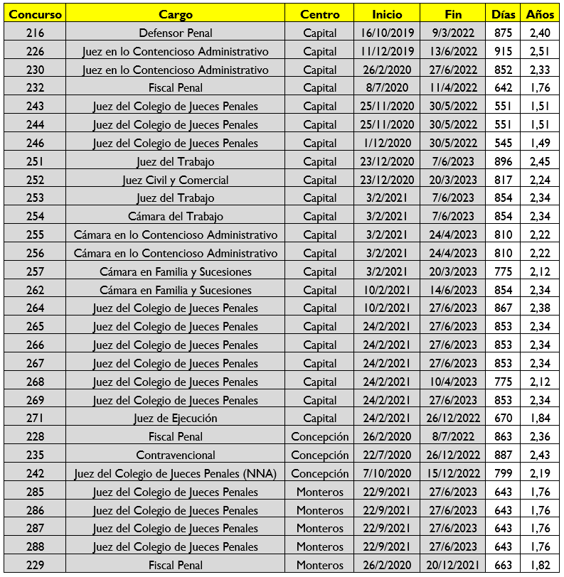 Vamos a saciar curiosidades. ¿Cuál es el concurso más demorado? He aquí la sorpresa, pues no es ninguno de los suspendidos cautelarmente, sino el 222 para cubrir el cargo de Defensor de Niñez, Adolescencia y Capacidad Restringida del Centro Judicial Monteros. Lleva 3,81 años abierto.