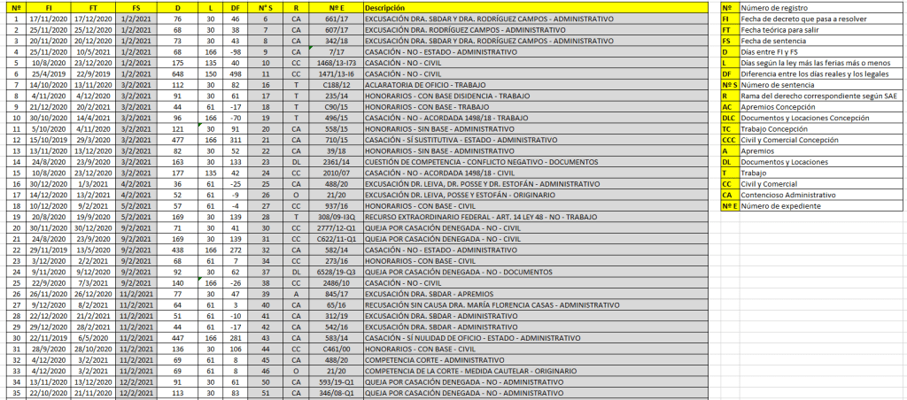 La principal fuente para esta tarea fueron los imprescindibles protocolos de sentencias de la corte disponibles en la web del Portal del SAE del Poder Judicial de Tucumán. De allí extraje los datos básicos: fecha de cada sentencia, número de sentencia, unidad judicial, número de expediente y descripción o título de cada sentencia. Esa información se volcó a una planilla de Excel en la que se construyeron varios datos más, cuyo aspecto ilustrativo puede verse en la siguiente imagen.
