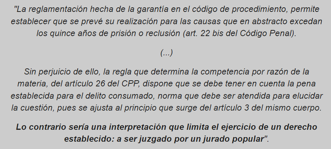Quizás esto es lo más importante (además de la claridad de los artículos): «no podés hacer una interpretación restrictiva, que limite el juicio por jurados». Al fin y al cabo es un derecho del acusado ¿no?
