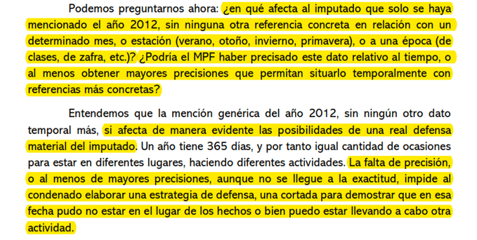 Por supuesto no se queda con eso, pues baja los conceptos al caso concreto, aunque antes da una respuesta al defensor Marcelo Romero: «no es posible defenderse de una acusación imprecisa, sin claridad, incompleta e indeterminada».