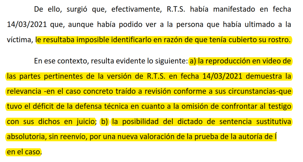 Obvio en la impugnación se reprodujo el video en forma total, donde quedó claro que R.T.S. dijo que era imposible identificar a quien ultimó a la víctima. ¿Entonces? Déficit técnico de la defensa probado y obvio, sale absolución sin reenvío.