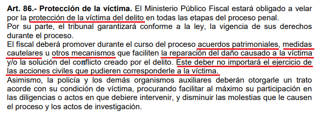 ¿Qué dice la norma invocada por la fiscalía? Que debe proteger a la víctima, que debe promover acuerdos patrimoniales, cautelares o demás alternativas para facilitar la reparación del daño que sufrió. Eso sí, no puede ejercer las acciones civiles, obvio.