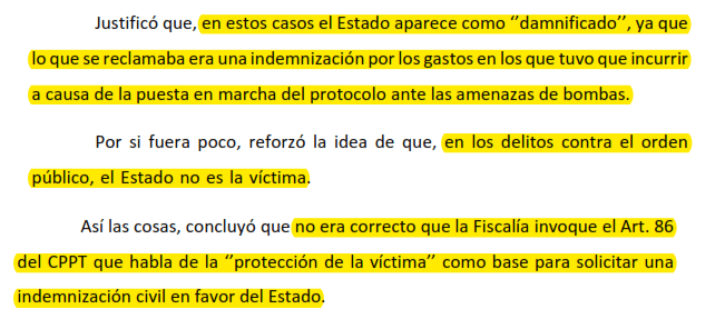 ¿Cómo terminó todo? Con el tribunal dándole la razón a la defensa pública: “Sr. MPF, una cosa son las víctimas del delito (las personas amenazadas) y otra cosa es el damnificado directo del delito (Estado), por ende, no tenía legitimación para pedir esto”.