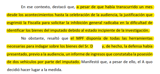 e) “Che pasó un mes desde el hecho y no hiciste ni el amague de averiguar los bienes de los acusados para clavar un embargo, de cómodo nomás clavaste la inhibición general de bienes”.