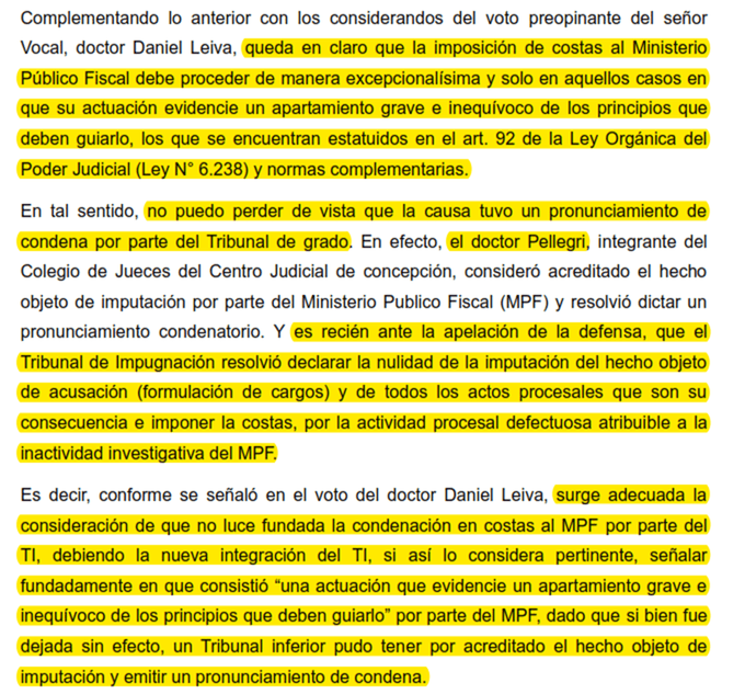 ¿Y qué agregó el voto dirimente, el que vino a formar mayoría? Poco, casi nada. Algo así como «che, acá hubo una condena del Sr. Juez Pellegri, no dejemos pasar esto, solo en la apelación de la defensa saltó esto de la nulidad, así que no hay fundamento en la codena en costas».