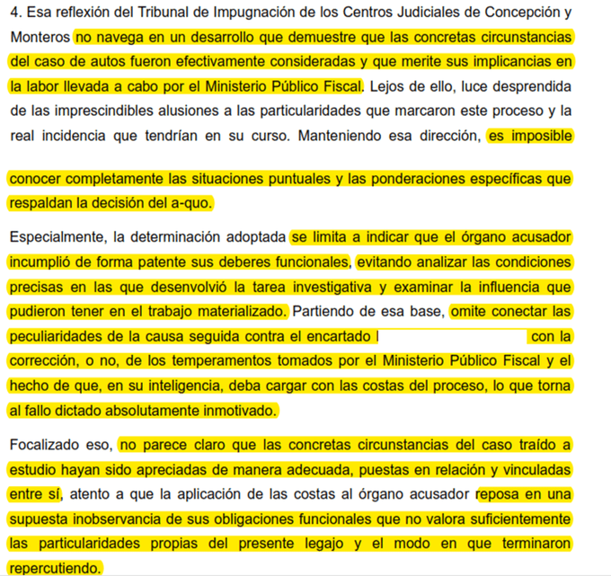 Sin embargo, esa misma generalidad es la vulnerabilidad del fallo, pues la corte tucumana entiende que no fue detallista sobre las circunstancias del caso. O sea, algo así como: «sea más claro al imponer las costas sobre lo que se hizo mal y tenga en cuenta el contexto del caso».