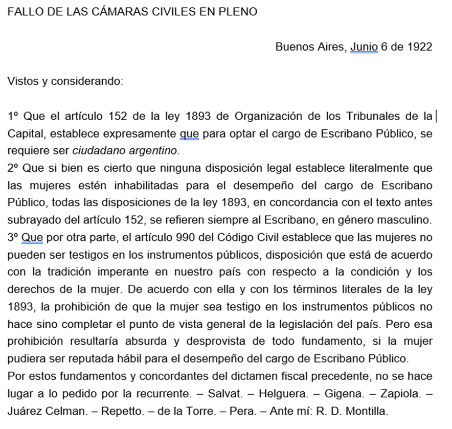 Senillosa, uno de los dos disidentes, sería más extenso: a) la incapacidad de las mujeres, por prejuicios tradicionales, está destinada a desaparecer; b) las mujeres pueden ser testigos en las actas del registro civil. A su postura le sumó dos argumentos infaltables (de hecho, lo usamos hasta el día de hoy): c) donde la ley no distingue no corresponde distinguir, d) lo que no está prohibido está permitido (artículo 19 de la Constitución Nacional).