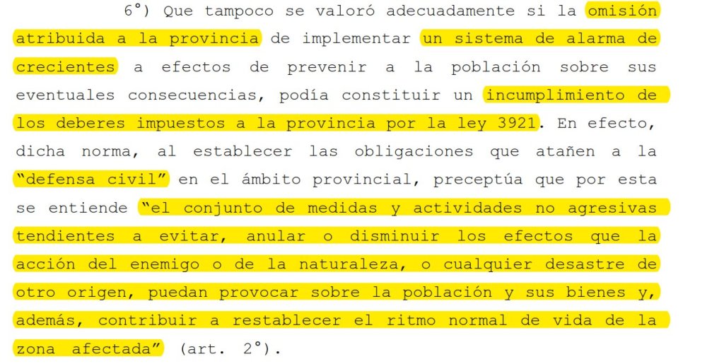 Segundo, no se valoró que la provincia habría omitido implementar un sistema de alerta de crecientes, según la ley provincial 3921. Es más, se cita el peritaje geológico al respecto.