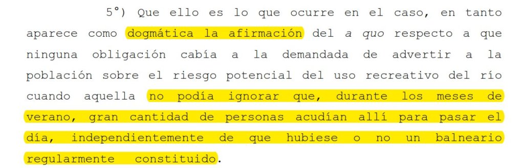 Primero, dice que es dogmática la afirmación de decir «no hay obligación de la provincia». «No importa si hay o no balneario constituido en el río, vos, como provincia, no podés ignorar que la gente va y se baña ahí» parece decir la corte.
