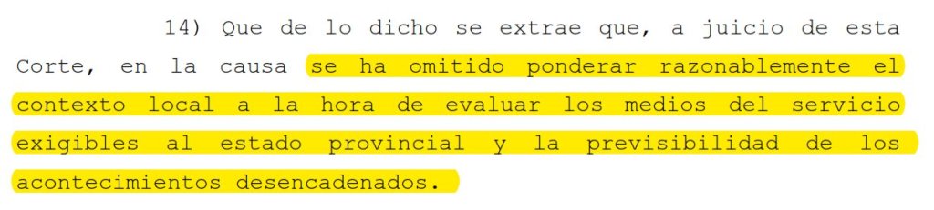 Con eso, a la corte le basta para descalificar la sentencia, pues el análisis sobre la falta de servicio del Estado debe hacerse en concreto y los planteos serios de la parte no fueron tratados adecuadamente por los jueces.