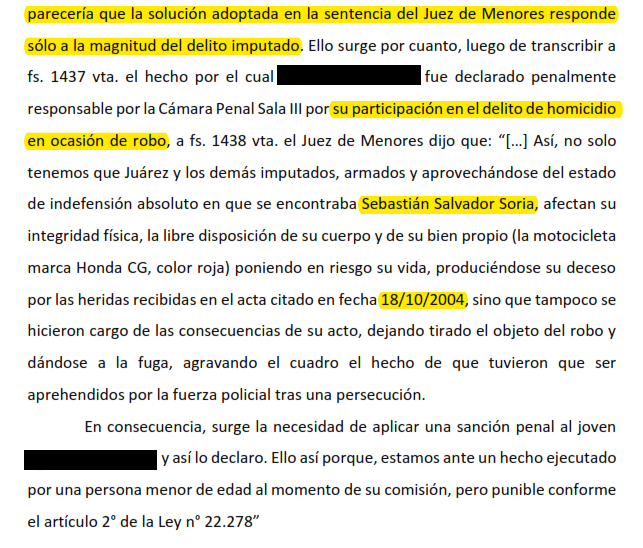 Pero además dice claramente que «la gravedad del hecho no es razón suficiente para aplicar pena a un imputado menor de edad al momento del hecho». ¿Por qué lo dice? Pues ese había sido el argumento clave del juez para imponer la pena como puede leerse: