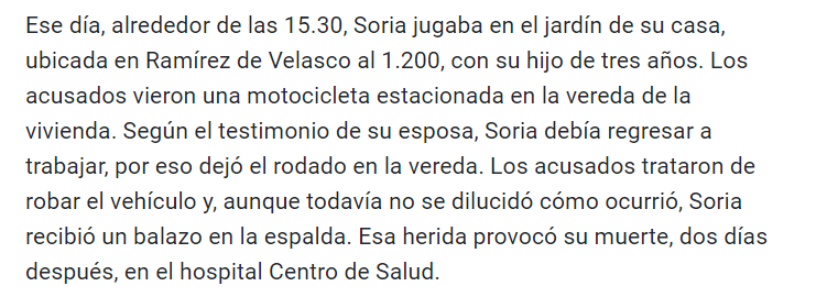 El 16 de octubre de 2004 mataron en el medio del robo de su motocicleta, a Sebastián Salvador Soria. Así describía el hecho el diario: