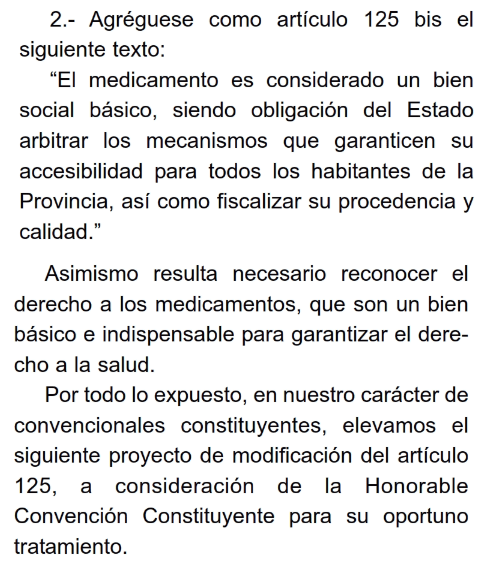 Vamos a la norma. La Constitución de Tucumán, sancionada en 2006 dice, en su artículo 146, que lo dedica al derecho a la salud, que el medicamento es considerado “un bien social básico” en un párrafo que dice así: «El medicamento es considerado un bien social básico, siendo obligación del Estado arbitrar los mecanismos que garanticen su accesibilidad para todos los habitantes de la Provincia, así como fiscalizar su procedencia y calidad».