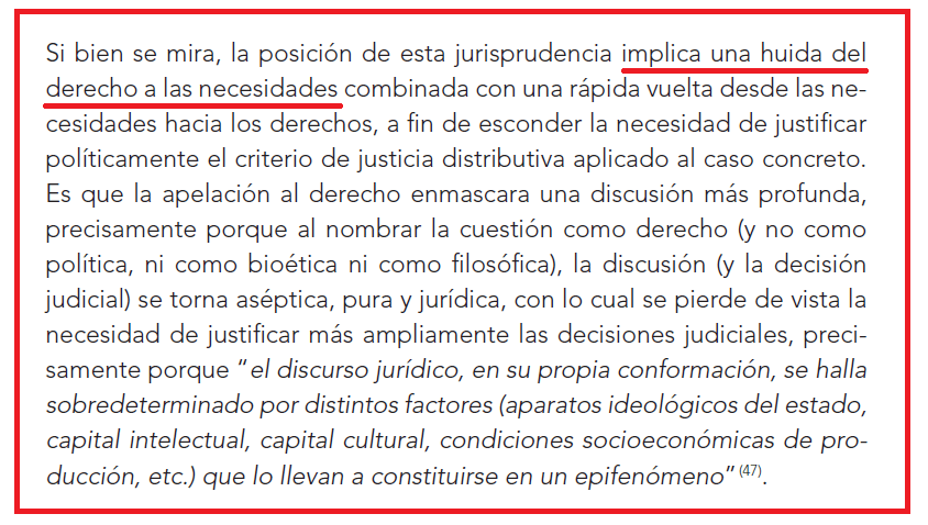 ¿Es acaso esta postura una “huida del derecho a las necesidades” para volver desde ahí a los derechos y zafar de justificar la justicia distributiva en el caso concreto? Ni idea. Demasiado filosófico todo esto…