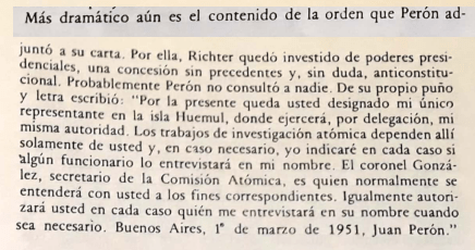 Richter como científico gozaba de una independencia absoluta, con el respaldo del primer mandatario. Sí, ya sé: ¿cuál era esa orden que Perón decía adjuntar? Pues, ni más ni menos que una delegación de sus poderes presidenciales en manos de Richter.