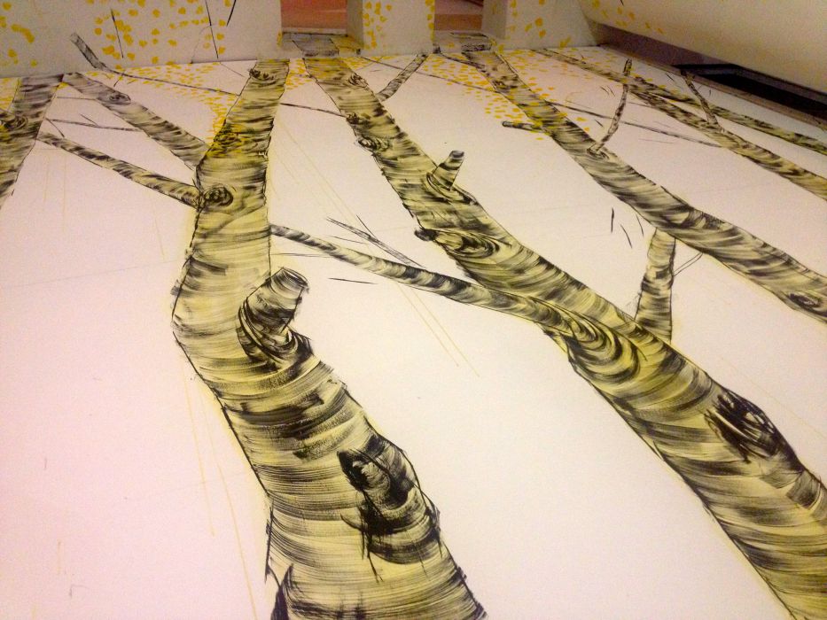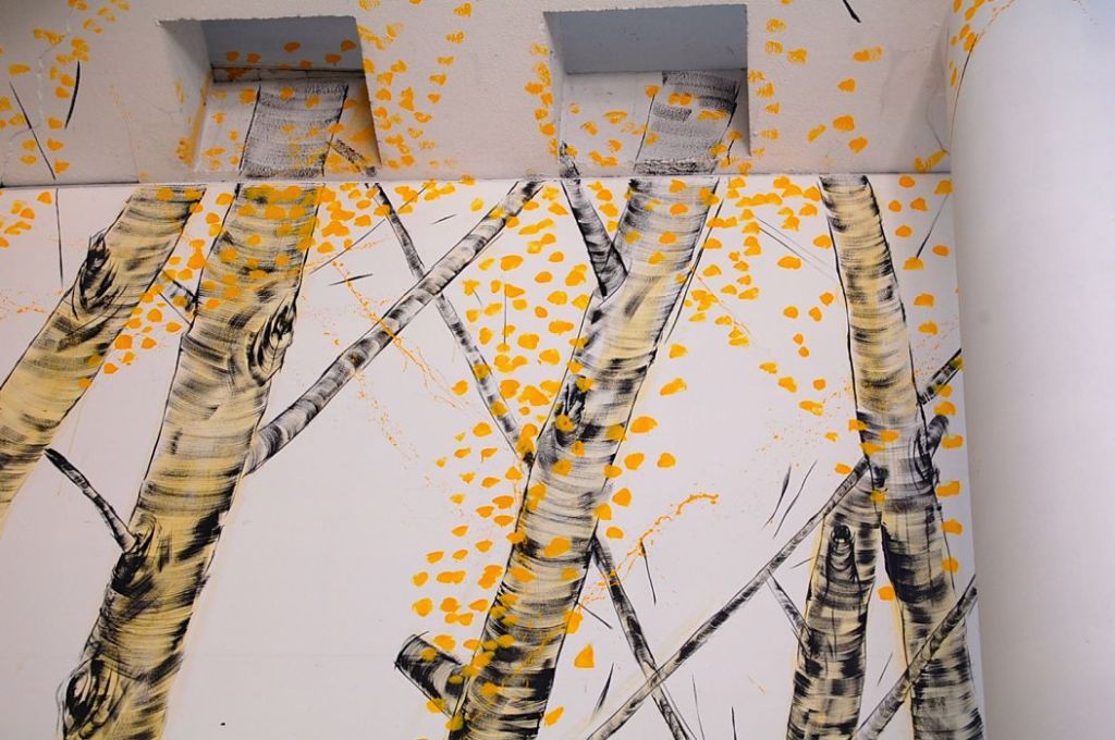 Obviamente, el David de la historia participó de semejante evento y realizó una obra de su especialidad: un mural de 12 metros de altura por 6 metros de ancho en pleno hall de entrada del shopping. Lo tituló Naturaleza en teoría, aunque en su web personal figura como Trees, our brothers, como pueden verse en las fotografías, estaba al lado de una escalera mecánica.