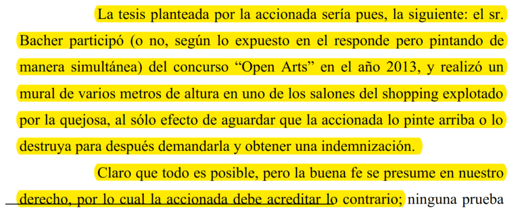 El tribunal entiende que la obra existió, así como también su tapada con pintura, lo que para un testigo (exagerado, parece) “fue como que alguien de la orden de tapar la Capilla Sixtina”. Eso sí, vuelve a machacarle a Goliat su falencia: “no hiciste ni un pliego de términos y condiciones para participar de Open Arts o al menos, no lo probaste, por ende, nada respalda tu versión de los hechos”. Y aclara que formalizar el contrato, lejos está de constituir un “blindaje jurídico” sino era dar pautas concretas y claras para el evento.