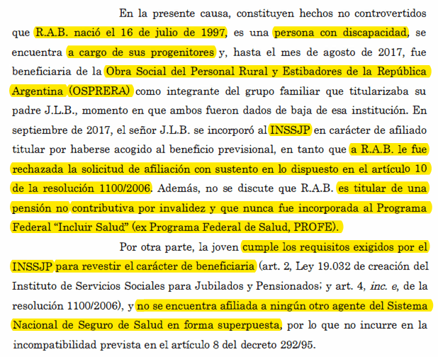 ¿Los hechos del caso? Acá, sobre esto no hay discusión: a) persona con discapacidad a cargo de sus progenitores; b) progenitor afiliado titular; c) requisitos cumplidos para afiliación; d) persona con discapacidad con pensión; e) afiliación rechazada.