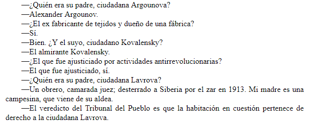 La respuesta del implacable juez para cerrar el caso es maravillosa: “La llamada justicia imparcial es un prejuicio burgués. Este es un tribunal de justicia de clase. Esta es nuestra actitud oficial y la base de nuestra conducta. ¡El siguiente!”