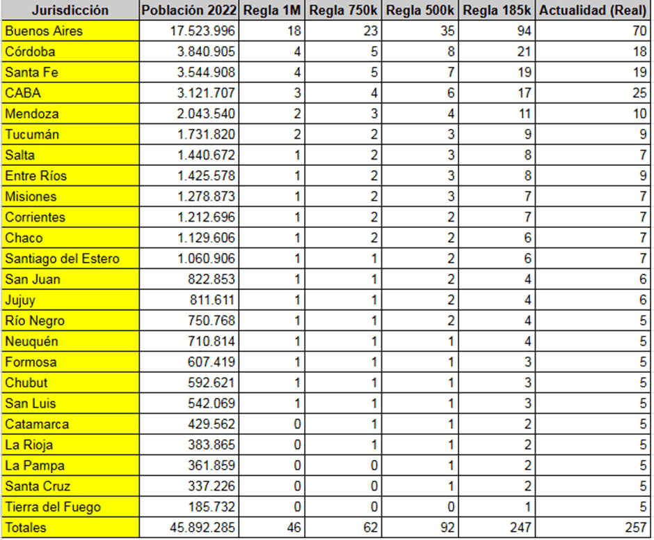 Ahora, ¿hay alguna alternativa que implique disminuir la cantidad de diputados nacionales que hoy son 257? Pienso que una podría ser llevar los números que exige el artículo 45 a 1.000.000 o fracción que no baje de 500.000 habitantes, o a 750.000 y 375.000 o a 500.000 y 250.000 o a 185.732 (la población de Tierra del Fuego) y 92.866. ¿Cómo quedaría la cosa? Como esta tabla: