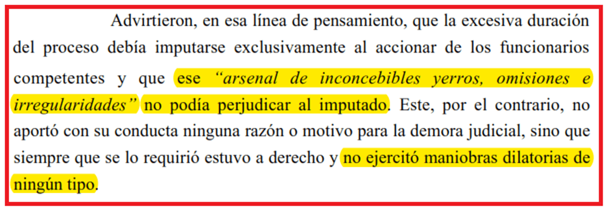 Insólitamente, el STJER, con un tono un tanto militarizado o armamentístico, reconoce que todo este quilombo no puede perjudicar al imputado que, justo en este caso no hizo nada para dilatar el proceso.
